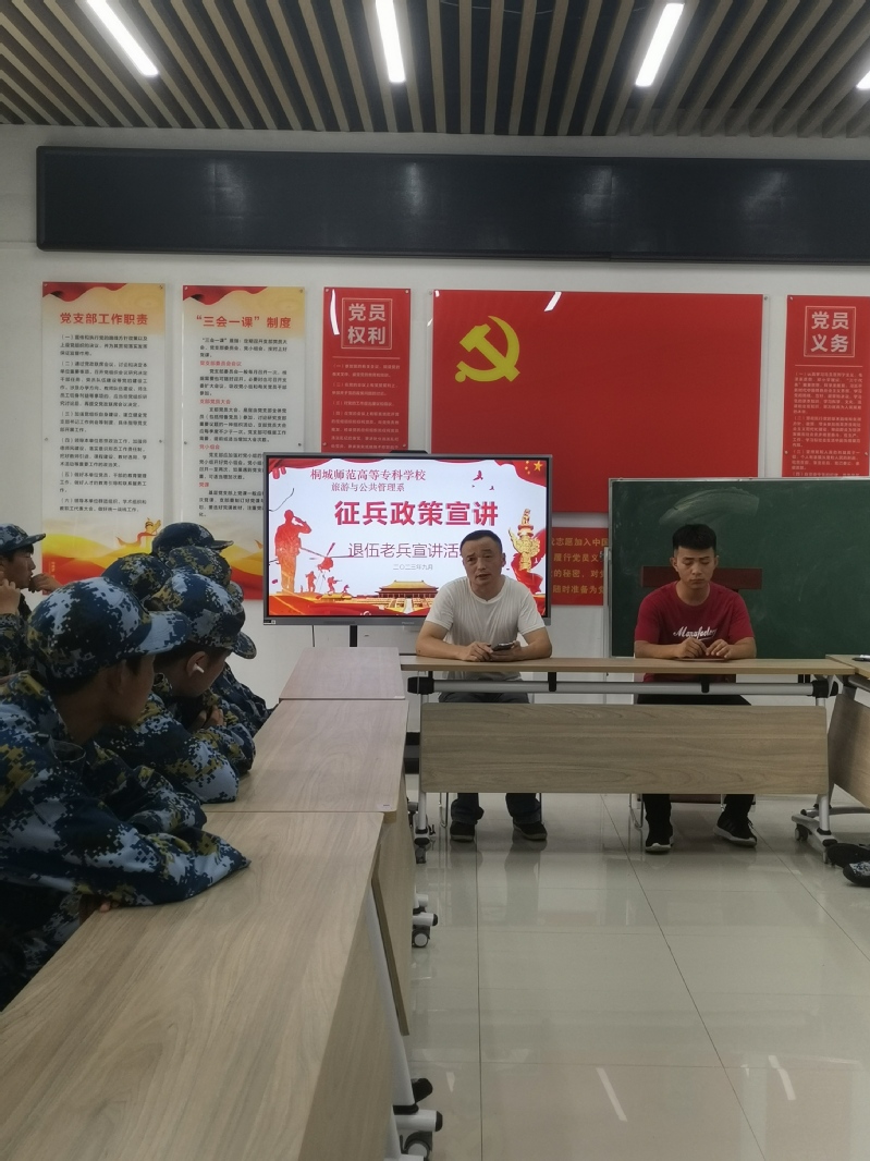 與此同時,旅管係借此大學習大討論時期積極宣傳大學征兵政策,鼓勵畢業生考慮選擇軍隊作為自己的發展方向。9月中旬,旅管係組織了一係列大學生應征入伍政策宣講會和谘詢活動,918日,特別邀請高專22級旅遊管理專業退役複學學生吳徐同學來到一站式學生社區,向學生們介紹軍隊的發展前景和培養計劃。通過這些宣傳活動,增強同學們對於軍隊事業的認知,引導他們樹立追求卓越、奉獻國家的意識。