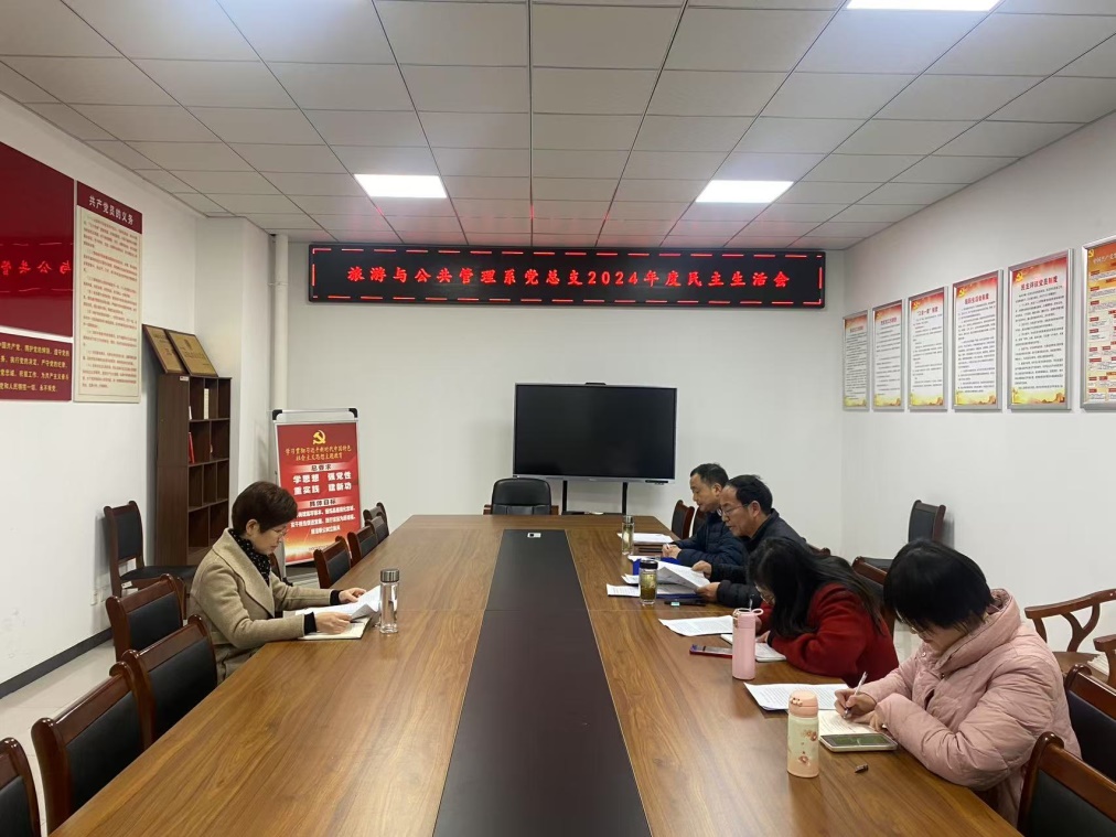 2025年3月13日下午,旅遊與公共管理係黨總支召開2024年度民主生活會,本次會議主題為:深入學習貫徹習近平新時代中國特色社會主義思想,鞏固深化黨紀學習教育成果,綜合發揮黨的紀律教育約束、保障激勵作用,為進一步全麵深化改革、推進中國式現代化提供堅強紀律保證。學校黨委副書記張敏麗同誌參會並點評,旅管係黨總支全體委員參加會議,會議由總支副書記汪庭才主持。