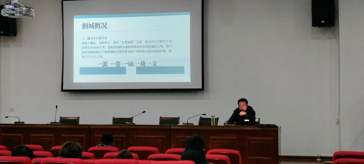 隨後,劉成龍老師將目光聚焦桐城的曆史文化,詳細介紹了桐城的著名景點。劉成龍老師用“一派一巷一廟一戲一文”高度精準概括了桐城極具代表性文化旅遊元素。從“桐城派”的文化聖地桐城文廟,到風景秀麗的龍眠山,再到蘊含曆史韻味的六尺巷,劉老師繪聲繪色的講解,讓同學們領略到桐城豐富的旅遊資源和深厚的文化底蘊。