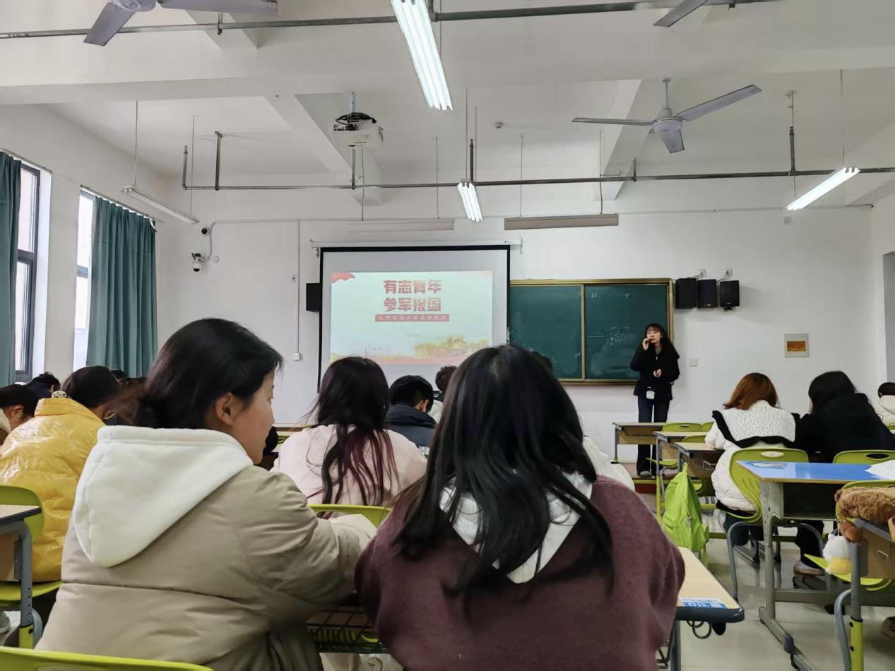 章俊介紹了我校當前的征兵政策,包括報名條件、征集流程、服役待遇,以及退役後的就業創業、升學優惠等政策內容。針對大家普遍關心的參軍後學業安排、未來發展等問題,進行了深入淺出的講解,讓在場同學對參軍的價值和意義有了更清晰的認識。