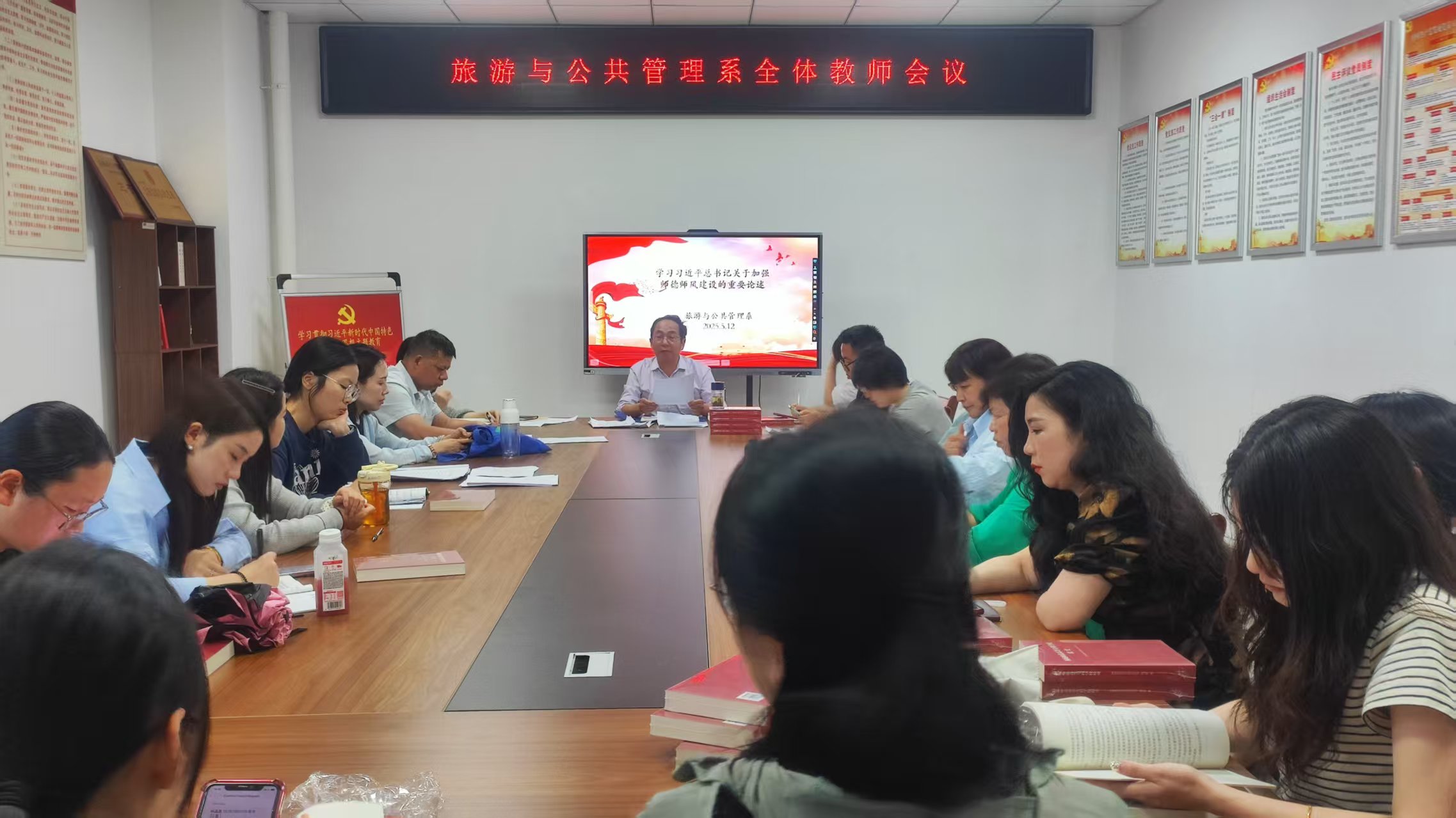 為認真學習貫徹習近平總書記關於教育的重要論述和全國教育大會精神,落實立德樹人根本任務,5月12日下午,旅遊與公共管理係在黨員活動室召開師德師風建設專題學習會議,旅管係全體教師參加會議,會議由汪庭才同誌主持。