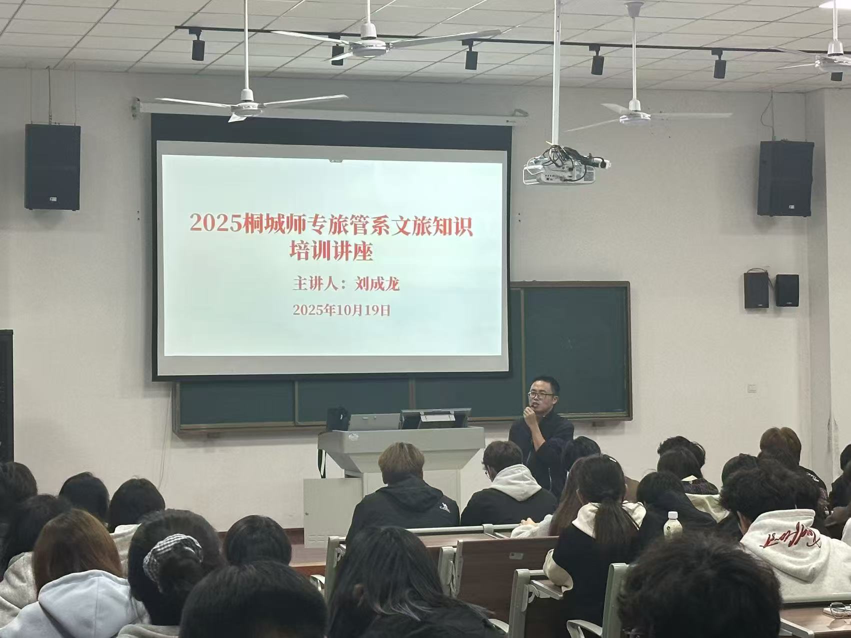20251019由旅遊與公共管理係主辦的桐城文旅知識講解培訓講座在以智樓報告廳舉行。本次講座由旅遊與公共管理係劉成龍老師擔任主講,圍繞桐城的曆史文化、名勝逸事及研學知識展開係統講解,旨在提升旅遊管理專業學生的專業素養與服務能力,進一步推動桐城文旅融合發展。