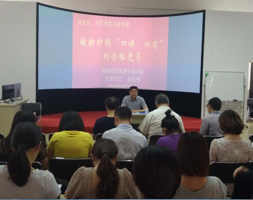 6月11日(黨員活動日),校黨委委員、紀委書記陳發明同誌到商貿與電子信息係給全體黨員和黨員發展對象上了一堂主題為:做新時期“四講、四有合格黨員”的黨課。
