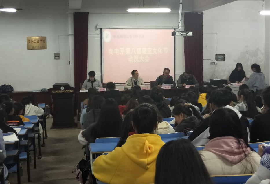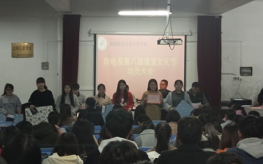 | 2018年11月14日晚7點半,由商電係團總支學生會舉辦的“第七屆寢室文化節”頒獎典禮和“第八屆寢室文化節”動員大會在學生活動中心召開,我係副主任王煥庭、徐偉,團總支書記張波,18級電子商務校企班輔導員方健等出席了本次會議。   副主任徐偉宣讀了第七屆獲獎寢室名單並進行表彰頒發了獎品。通過觀看獲獎視頻关键词2發現所有參賽寢室都進行了精心裝扮,認真準備,給关键词2展現了一個個溫馨的宿舍,溫馨的家,也得到了各級領導的肯定。獲獎寢室如下:一等獎:居仁樓301,給力樓526;二等獎:樹慧樓402、403,給力樓403、604;三等獎:居仁樓210、206,樹慧樓401,給力樓519,致和樓517,520;最佳獎:給力樓509、510、511、525。  頒獎完畢後,對第八屆寢室文化大賽進行了動員。校企合作班輔導員方健老師宣讀了這次寢室文化設計大賽的通知以及注意細則,隨後副主任王煥庭對寢室文化設計大賽進行了動員講話,強調了寢室文化大賽的意義和重要性。他指出寢室是學生生活學習的重要場所,是開展學生思想政治教育的重要陣地,是育人的主要課堂,寢室環境和寢室生活對學生的健康成長有巨大的影響。各種思想在宿舍匯集和撞擊,截然相反的性格、情趣不同的愛好、百態各異的生活習慣在這裏匯聚、交流,迥然不同的精神層次、參差不齊的道德修養在這裏形成品格的合力,共同提高、傳播、升華。伴隨著同學之間思想、性格、追求的不斷融合,寢室裏形成了有自己特點的文化氛圍,這種潛在的精神狀態和極富凝聚力的氛圍,被大家稱作“寢室文化”。寢室文化是以學生為主體,以寢室為主要活動空間,以課外活動為主要內容,以校園精神為主要特征的一種群體文化。我係舉辦寢室文化節就是為了通過對“寢室文化”內涵的挖掘,作為課堂教學的擴展和延伸,倡導和加強寢室文化建設,加強有效管理、提高大學生思想道德水平的必要組成和重要手段。 寢室是关键词2的第二個家,良好的寢室文化環境,有利於學生在大學裏的成長,豐富了我係廣大學生的課餘生活,推動了我係宿舍以及校園文化的發展,營造了良好的學習生活氛圍,預祝此次寢室文化大賽取得成功! (撰稿:係學生會組織部) |