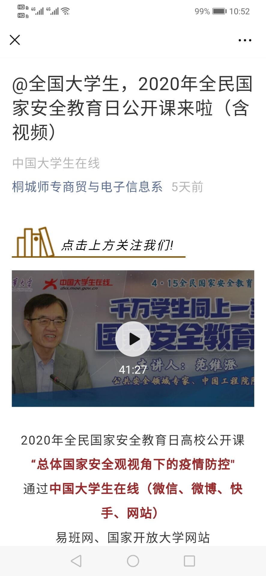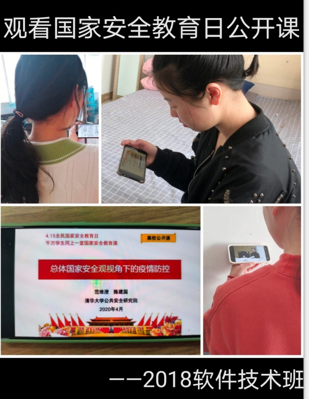 我係各班級組織學生通過中國大學生在線等網絡平台於4月15日集體觀看千萬學生同上一堂國家安全教育課。來自清華大學的公共安全領域專家、中國工程院院士範維澄以“總體國家安全觀視角下的疫情防控”為主題並圍繞國家安全的內涵體係、麵臨的風險和疫情防控等發麵進行了係統化講解,在我係學生群體中引起了熱烈反響。