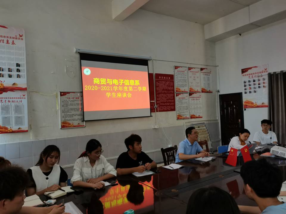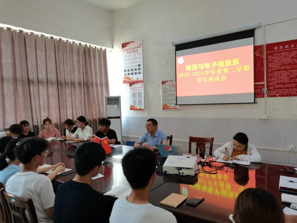 為深入學習貫徹習近平總書記在黨史學習教育動員大會上的重要講話精神和全省黨史學習教育動員部署大會精神,按照學校的部署和工作安排,進一步推進加強青年學生“四史”學習教育,商貿與電子信息係於2021年6月9日下午在黨員活動室舉辦了“我為師生辦實事”學生座談會。座談會由係副主任王煥庭主持,係團總支書記兼學管幹事胡豔豔及各班級學生代表參加座談。