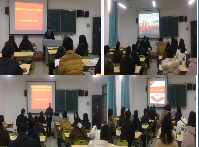 12月6日係黨總支書記蘇澤軍以“黨的百年奮鬥經驗和重大成就”解讀黨的十九屆六中全會,並帶領全係教職工和黨員幹部共同學習了習近平總書記在黨的十九屆六中全會上的重要講話和《中國共產黨第十九屆中央委員會第六次全體會議公報》,就黨的曆史《決議》的重要意義、十九屆六中全會的主要精神、如何深入貫徹學習並落實全會精神等三方麵進行深入學習。強調全係師生要認真學習貫徹落實全會精神,在以習近平同誌為核心的黨中央堅強領導下,以史為鑒、開創未來,為實現第二個百年奮鬥目標、實現中華民族偉大複興的中國夢不懈奮鬥。作為高校教師,关键词2要全麵準確宣傳黨的十九屆六中全會精神,把思想和行動統一到全會精神上來,在校黨委的領導下,埋頭苦幹、勇毅前行,深入推進黨史學習教育,發揚偉大建黨精神,牢記立德樹人根本任務,全麵參與“三全”育人工作,推進學校各項事業發展。