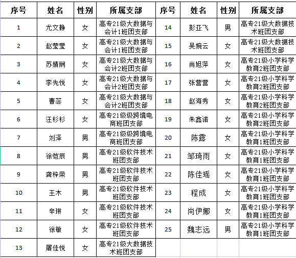 根據《桐城師範高等專科學校學生獎勵管理規定(試行)》文件精神和要求,按照優秀團員評選條件,經學生申請,班級成立評議小組,班主任(輔導員)組織學生民主評議、係部初審,擬評出我係尤文靜等25名同學作為入黨積極分子發展對象,現將結果予以公示: