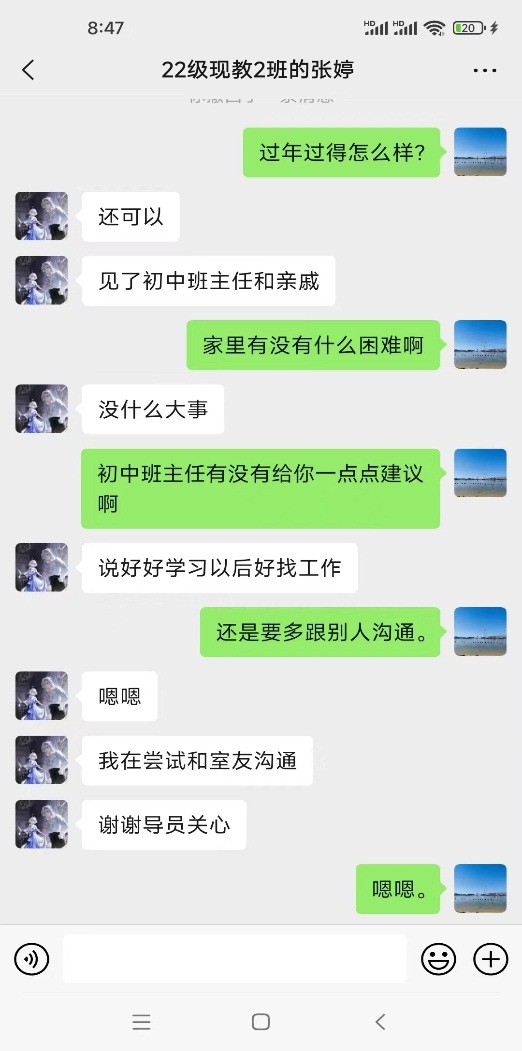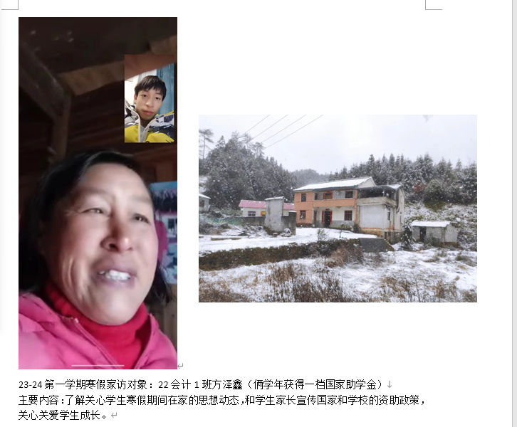 寒假期間,我係組織各班輔導員開展家庭經濟困難學生的線上家訪,通過微信視頻、電話溝通、線上語音文字交流、等方式與 14位學生及家長進行一對一溝通交流,家訪前,輔導員們做足功課,通過對學生進行分類篩選,深入分析了學生的個人特點,針對學生學業以及未來發展進行細致規劃。家訪溝通中,介紹了學生在校表現,學校發展規劃,針對性的宣傳了國家和學校相關資助政策,傾聽了學生及家長對學校人才培養的建議和意見。學生和家長對學校表達感謝之餘,也肯定了學校的工作以及老師們對學生的關心和愛護,將來用自己的實際行動報效國家,回饋學校。