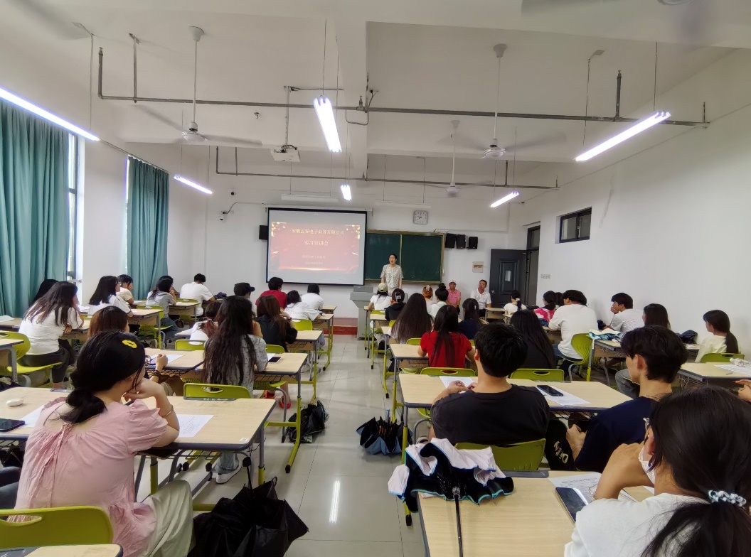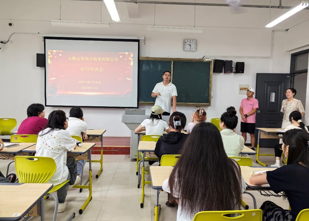 為深化校企合作、拓寬學生實踐渠道,93日下午,安徽雲霽電子商務有限公司來我係開展實習宣講活動。商電係主任徐偉、教學副主任李燕、企業汪總及200餘名學生共同參與。