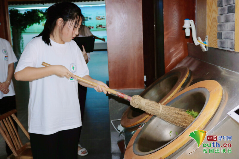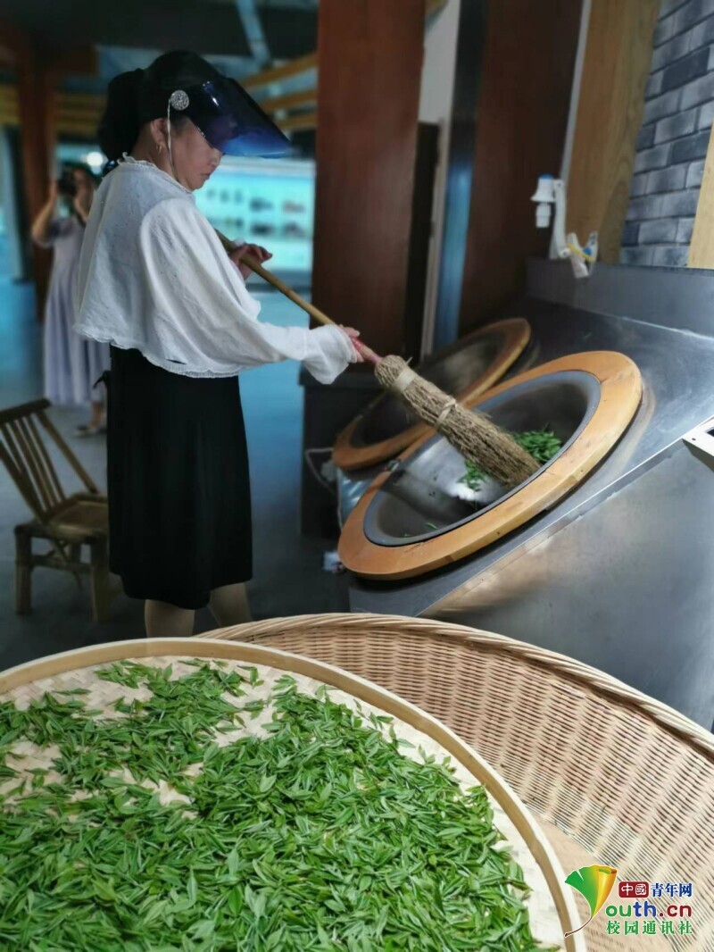 圖為專業炒茶師傅為小組成員演示炒茶第一道工序殺青。
