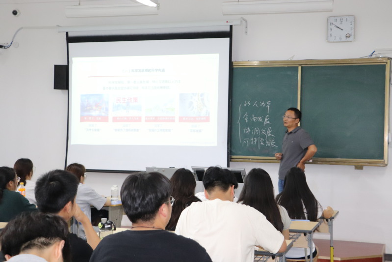 課上,楊季兵老師以“科學發展觀的科學內涵”為主題,通過案例分析、邏輯推理、板書梳理等教學方法,主題突出、條分縷析,讓學生明晰了科學發展觀的科學內涵。