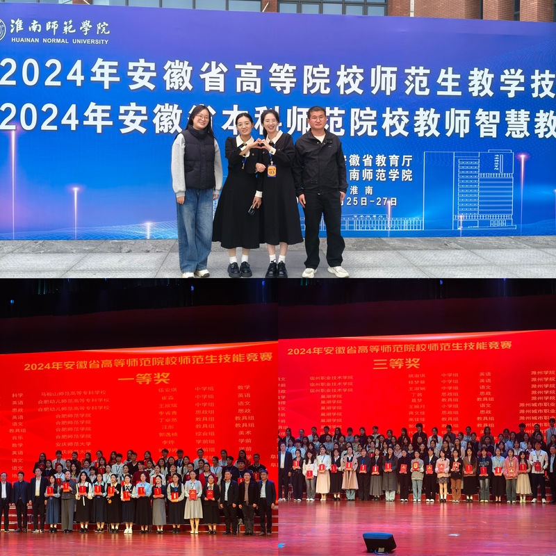 1026-27日,2024年安徽省高等院校師範生教學技能競賽在淮南師範學院泉山校區圓滿落幕。經過教學設計、課件製作、即席演講和有生上課等環節的激烈角逐,初專2020級學生薑利敏、朱榕芳思政課教師雷小麗、黃俊、陳超和龍澹寧的指導下參加比賽,分別斬獲一等獎三等獎