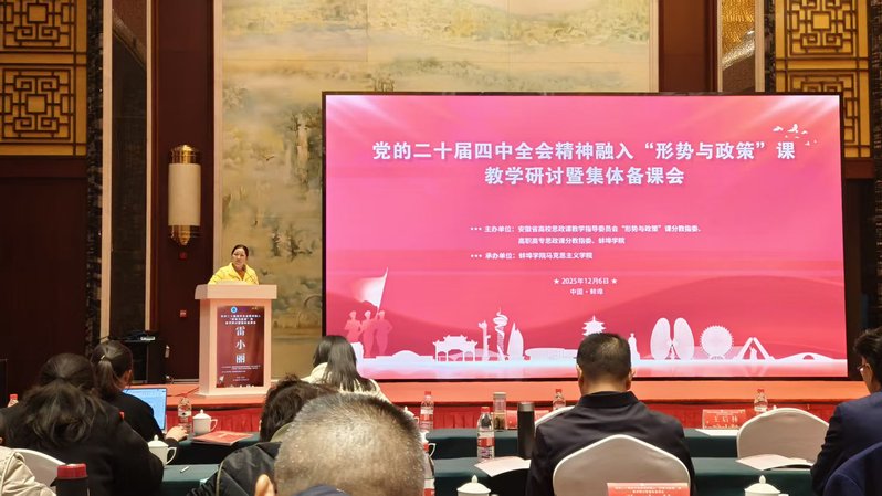 為深入學習貫徹黨的二十屆四中全會精神,推動“形勢與政策”課高質量發展,切實將全會精神融入思政課程教學,2025年12月6日至7日,黨的二十屆四中全會精神融入“形勢與政策”課教學研討暨集體備課會在蚌埠學院舉行。學院兩位教師代表參加會議。