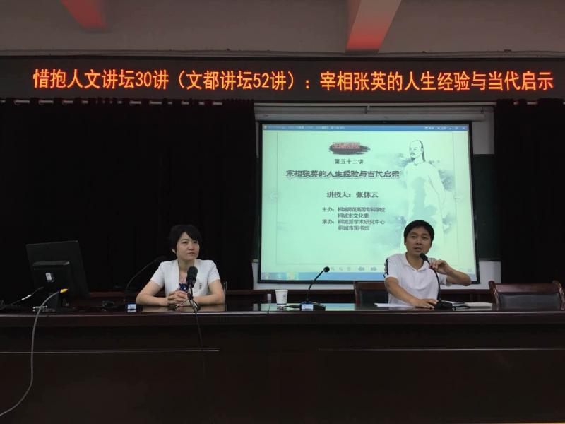 6月11日,由桐城師範高等專科學校、桐城市文化委聯合主辦,桐城派學術研究中心、桐城市圖書館承辦,小學教育係、桐城文化愛好者協會協辦的惜抱人文講壇第30講、文都講壇56講在以智樓一樓報告廳舉行,邀請合肥學院中文係副教授張體雲,主講“宰相張英的人生經驗與當代啟示”,從張氏家族後人的角度,和大家一起分享張英的為人、為官、為學的態度。桐城市文化委、桐城市圖書館、桐城派學術研究中心部分成員以及小學教育係一百餘名學生聆聽了講座。桐研中心副主任陶家韻主持講座。