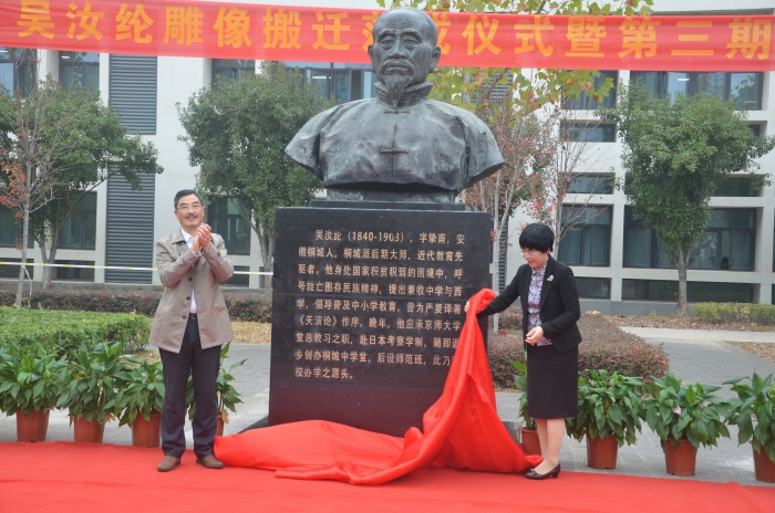 1904年,桐城學堂總理馬其昶秉承桐城派後期大師吳汝綸先生遺誌,在桐城學堂創立師範班,開啟了近代桐城的師範教育,我校曆經百年發展,2021年9月,學校整體搬遷至新校區辦學,吳汝綸雕像隨後於今年暑期搬遷落成新校區毓秀樓前,儀式上,校長沈波、副校長程玉梅共同為吳汝綸雕像揭幕。