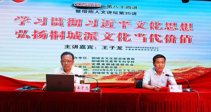 王子龍講座的題目是《學習貫徹習近平文化思想 弘揚桐城派文化當代價值》,從“學習貫徹習近平文化思想”、“契合習近平文化思想的桐城派文化當代價值”、“推進桐城派文化傳承與發展”三個方麵進行闡發,以全新的視角研究桐城派,以豐富的事例闡釋學理、哲理、道理,講座貼近桐城實際,精辟概括了桐城派文化當代價值的七個特征,提出弘揚桐城派文化的思路和舉措,具有很強的前瞻性、可操性和指導性。
