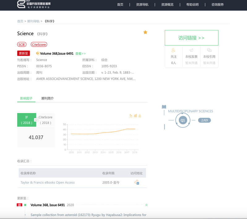 期刊導航可以可以實現JCR的分區分類,也可以按刊名首字母,學科,語種等方式進行分類。對每本刊都做了詳情頁,讀者可以通過詳情頁了解本刊曆年的影響因子,分區情況,收錄年限及最新一期的數據情況。