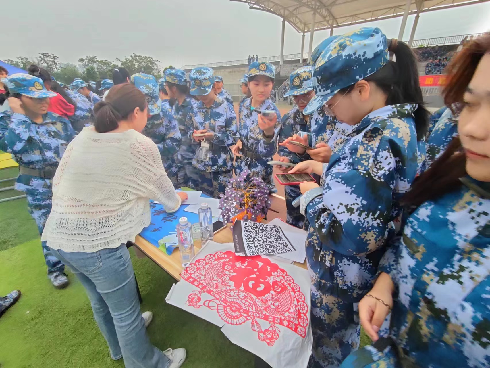 各個社團按照事先安排的順序在操場中央進行集中展示,為新學期的“招兵買馬”而各顯神通。悅耳動聽的音樂、靈動飄逸的舞姿、引起陣陣歡笑的相聲表演,無不吸引著身著迷彩服的新生的目光。