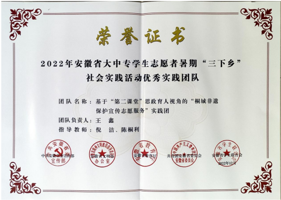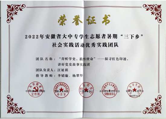 近日,中共安徽省委宣傳部、安徽省文明辦、安徽省教育廳、共青團安徽省委、安徽省學生聯合會等五部門聯合發布《關於公布 2022 年安徽省大中專學生誌願者暑期“三下鄉”社會實踐活動評選結果的通報》(皖青聯〔2022〕43 號),對2022年安徽省暑期社會實踐活動進行了總結表彰。