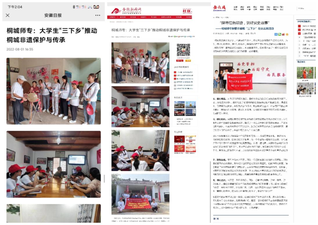 活動開展期間,各團隊充分利用“桐城師專青年”等校方微信公眾平台、各係官方網站等學校新媒體以及中青校園、中安在線等校外平台,通過文字、圖片、視頻等方式,及時將社會實踐中的所見所聞所思進行展示、分享,形成多篇有價值的團隊及個人社會實踐報告,切實加強實踐成果宣傳轉化,引領我校青年學生在社會課堂中“受教育、長才幹、作貢獻”,幫助青年學生不斷提升社會化能力,上好與現實相結合的“大思政課”。