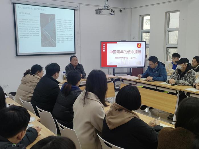 王子龍圍繞“新時代中國青年的使命職責”這一主線,指出黨對青年寄予厚望,作為新時代大學生,要牢記習近平總書記的囑托,勇於擔當時代賦予的曆史責任,勇於拚搏奮鬥,肩負起中國青年必須肩負的曆史使命,讓青春在全麵建設社會主義現代化國家的火熱實踐中綻放絢麗之花。希望青年學生們能夠做到立誌有為、勇於擔當,不負偉大新時代。第一要堅定理想信念,堅定“四個自信”;第二要增強“四個意識”,做到“兩個維護”;第三要努力學習實踐,練就過硬本領;第四要勇於砥礪奮鬥,投身強國偉業。說明:2