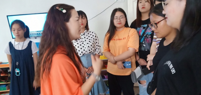通過負責人的講解,隊員們也了解到他們的教育理念。新愛嬰早教機構以蒙台梭利的教育理念開展教學。以兒童發展敏感期為關鍵,以三個月為基礎觀察孩子,並用文字記錄這些孩子的成長。並三個月一次為這些孩子做測評。幫助孩子安全度過關鍵期,來促進孩子未來更好發展。隊員們跟隨園長參觀,認真聽園長講述課程安排。
