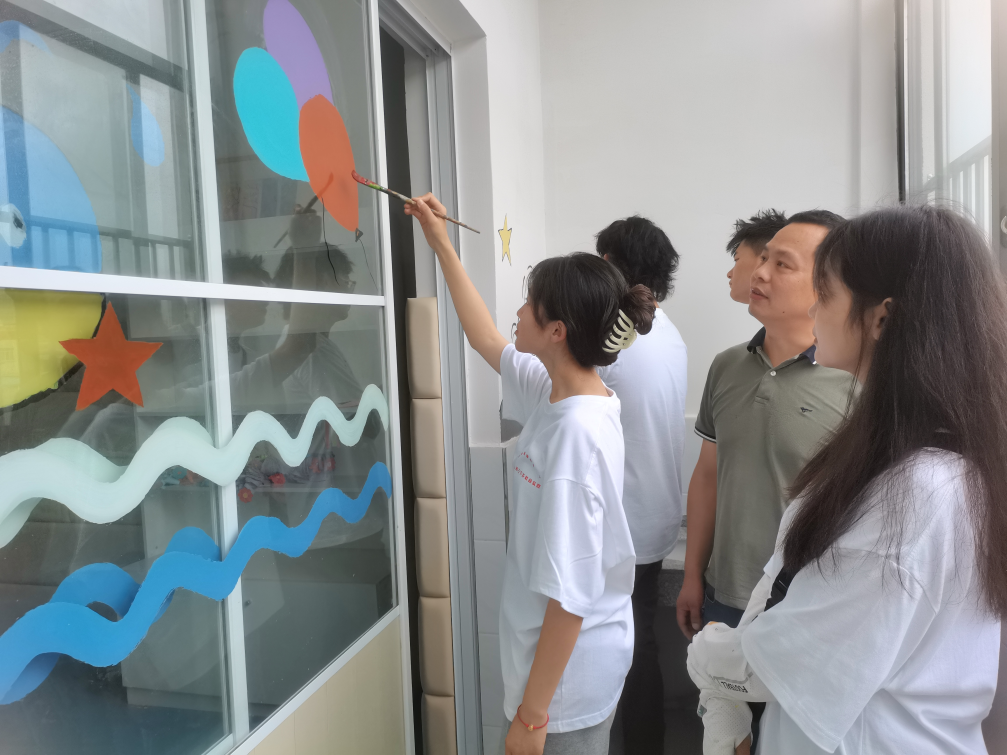 在相關功能室,按照約定的牆繪設計方案要求,團隊成員開展牆繪活動,對牆麵,門玻璃等位置進行美化設計、繪製圖案。