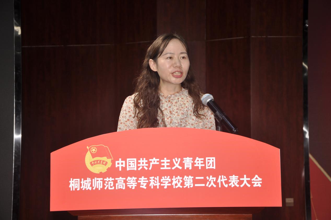 項薇代表共青團安慶市委向大會的召開表示熱烈祝賀,向出席本次大會的全體代表以及全校團員青年和團幹部們致以誠摯的問候和良好的祝願,並向學校共青團工作提出幾點希望:一是希望全體團員青年堅定聽黨話,永遠跟黨走,牢記黨的奮鬥主題就是團的行動方向,立誌做新時代好青年;二是希望廣大團學幹部弘揚師專校訓精神,創造性開展工作,在團學舞台上展現自我風采;三是希望師專各級團組織傳承紅色革命精神,牢記為黨育人、為國育才的初心使命。