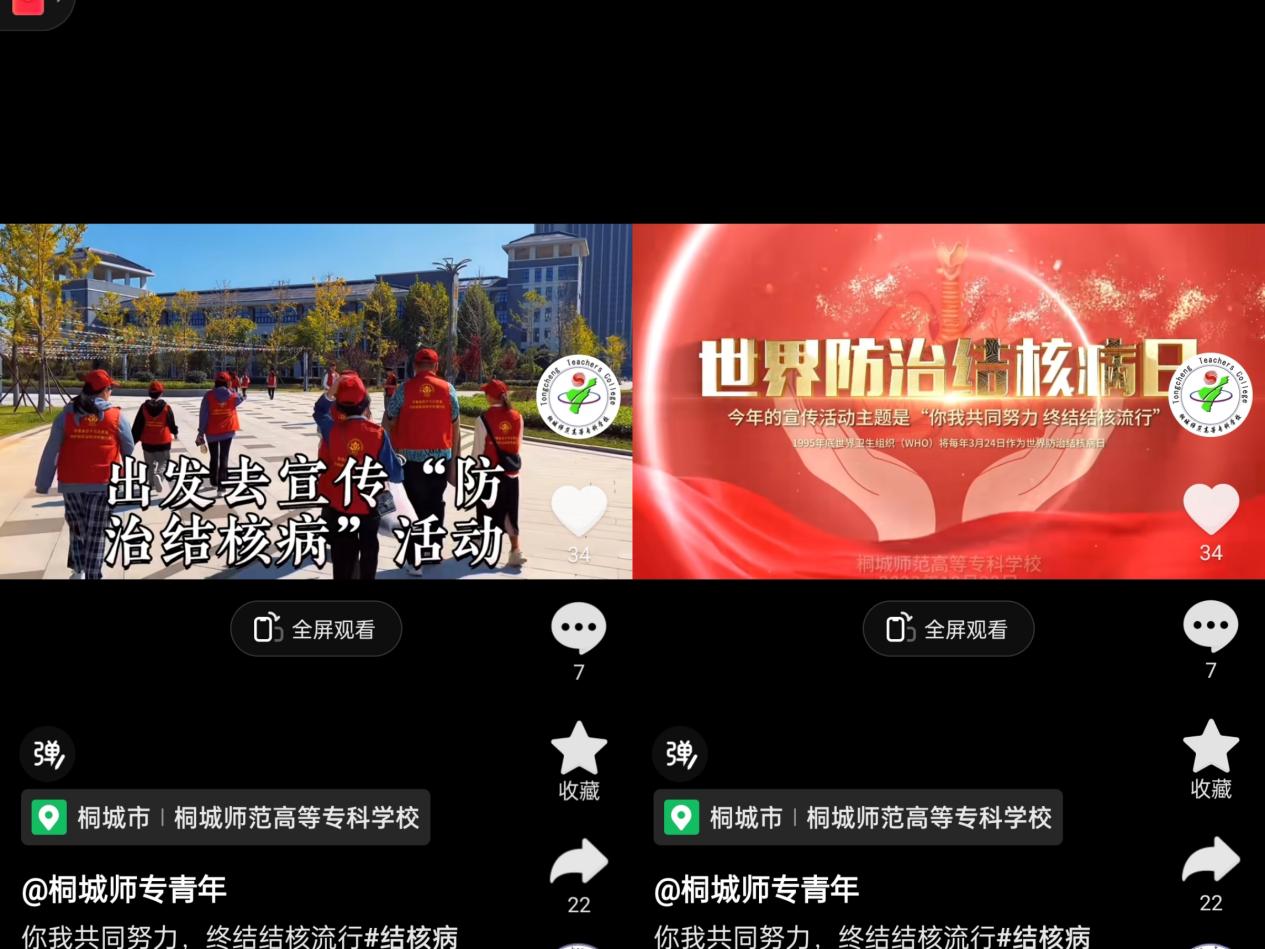 活動結束後,為鞏固結核病防治的宣傳效果,提升結核病防治的宣傳覆蓋麵,我校利用“桐城師專青年”抖音號發布結核病防治宣傳視頻,進一步提升本次結核病防治宣傳活動的社會效益。