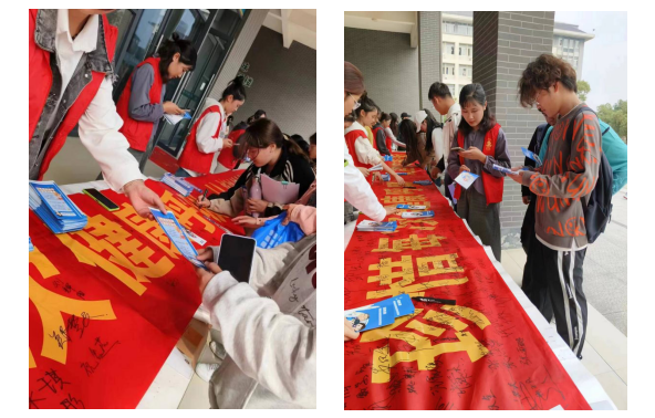 2023年10月9日,“啟明心”青年誌願者協會在食堂一樓門口開展以“珍惜每次健康呼吸,從控製結核病開始”為主題的橫幅簽字活動。活動現場,誌願者們身穿紅色馬甲,為廣大師生宣傳結核病防治知識,分發結核病防治手冊,有效提高了結核病防治在我校的知曉率和普及率。同時,廣大師生紛紛在宣傳橫幅上簽下自己的名字,積極加入到防治肺結核的行動中來!