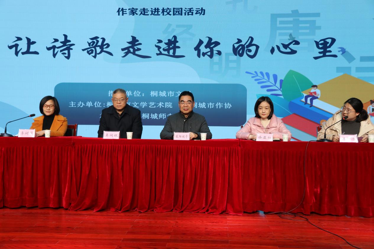 12月14日,校團委聯合桐城市文聯、桐城市文學藝術院、桐城市作協主辦的“作家進校園”活動在我校音樂廳成功舉辦。桐城市文聯黨組書記、主席歐陽健子,桐城市文聯黨組成員、文學藝術院院長徐亞紅,中國作家協會會員、桐城市政協文史委員吳問銀,校團委書記汪若冰出席了講座。桐城市作家協會、桐城市詩詞協會、桐城市攝影家協會部分作家藝術家等,以及桐城師專在校學生200餘人,聆聽了講座。
