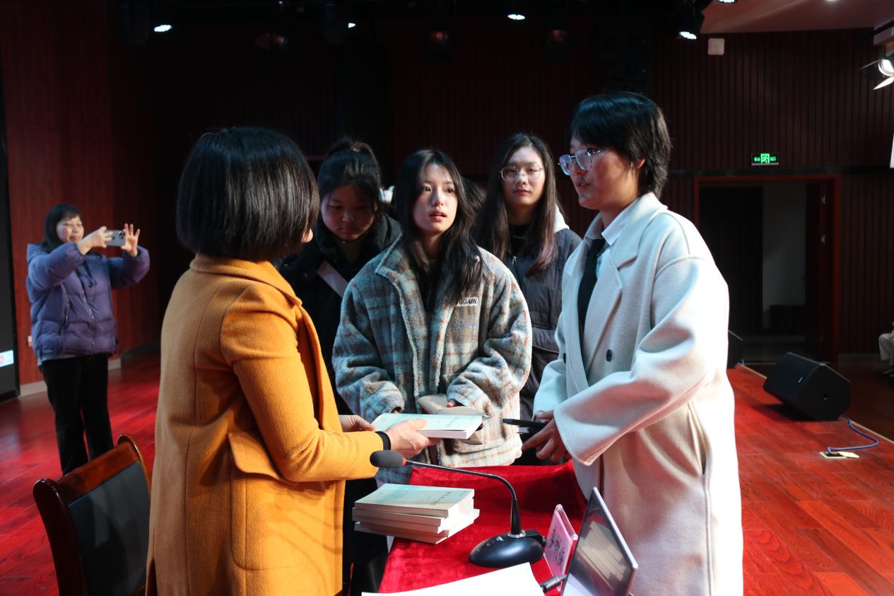 在互動環節,針對學生在微信群中提出的“詩歌寫作技巧”“詩歌是否要求對仗押韻”“詩歌創作有沒有靈感”等問題,作家李樹俠結合自己的詩歌閱讀和創作實踐,逐一進行了解答。群內提問活躍,台上解答具體,現場氣氛熱烈。最後,作家李樹俠還向部分學生簽名贈書,並對同學們表達了誠摯的祝福和真切的期盼。