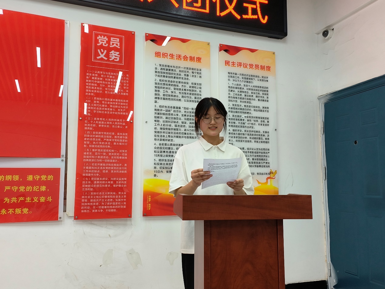 來自23小教文1班的馬文迪同學作為新團員的代表發言,她說出了所有新團員的心聲,加入共青團是自己成長道路上的一座重要裏程碑,大家將會以此為契機,更加努力學習、積極實踐,為集體爭光、為社會貢獻自己的力量,立誌做一名優秀的共青團員。