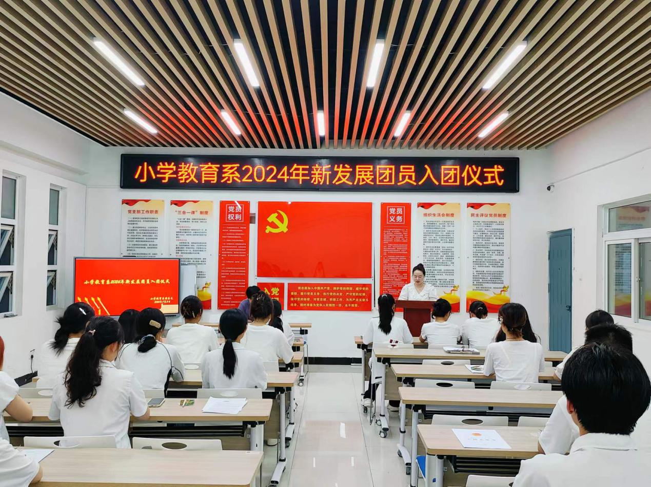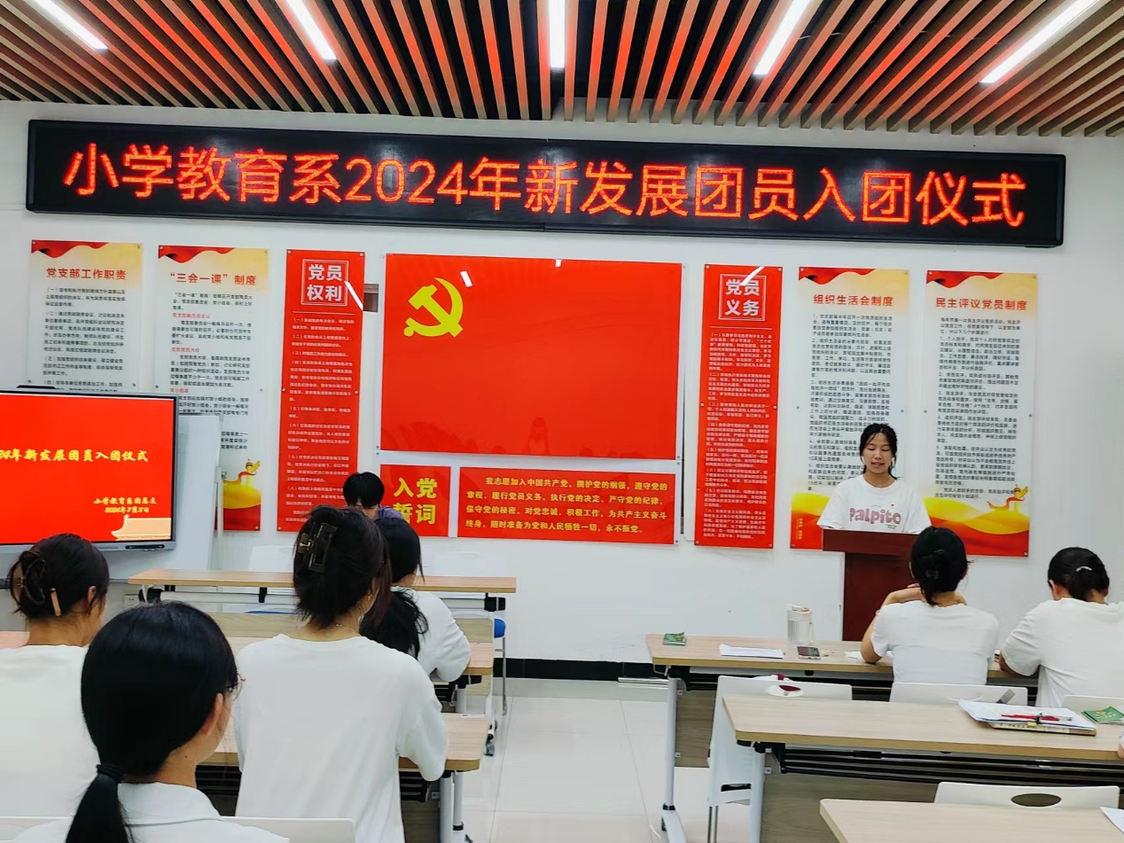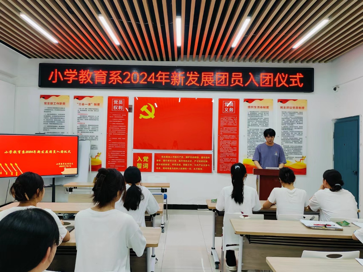 習近平總書記指出,入隊、入團、入黨,是青年追求政治進步的“人生三部曲”為加強共青團隊伍建設,激勵青年學生樹立團員意識和自覺,堅定不移聽黨話、跟黨走,真正做到思想上入團、行動上入團、組織上入團。73日晚,小學教育係在一站式學生社區舉行了2024年新團員入團儀式。小教係學生黨支部組織委員郭曉瑋老師小教係2024年新發展團員、優秀團員代表共同參加。儀式由小教係團總支書記程蓉蓉主持。