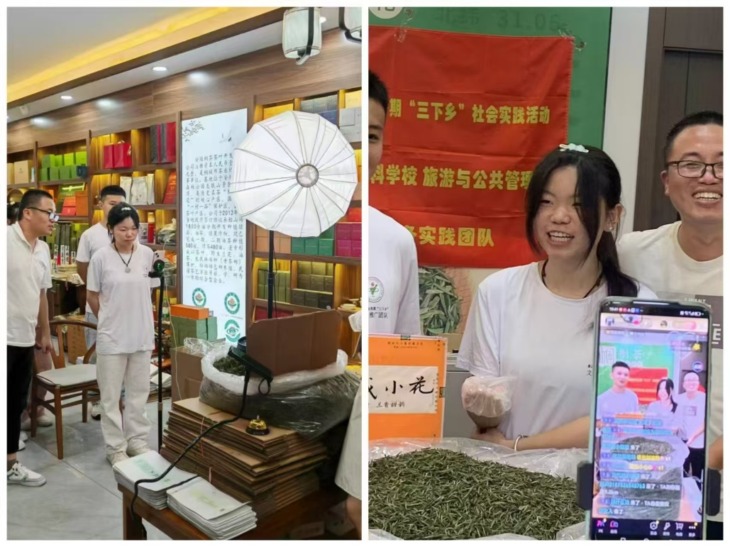 直播助農產品,強化責任之美。實踐隊員們深入寶山灣茶葉直播間,根據茶葉的特點編排直播內容,通過抖音直播帶貨、短視頻製作等,讓桐城小花茶產業走進大眾視野。直播時,同學們從茶葉品類、茶葉製作流程等方麵進行推介,還現場泡製、品嚐,與粉絲互動,氛圍感十足。隊員的優異表現也展現了新時代青年的社會責任感,紛紛表示未來會積極參與助農事業,積極發揮自身專業優勢,創新“旅遊+農業+直播”結合模式,為本地農產品銷售貢獻自己的力量。