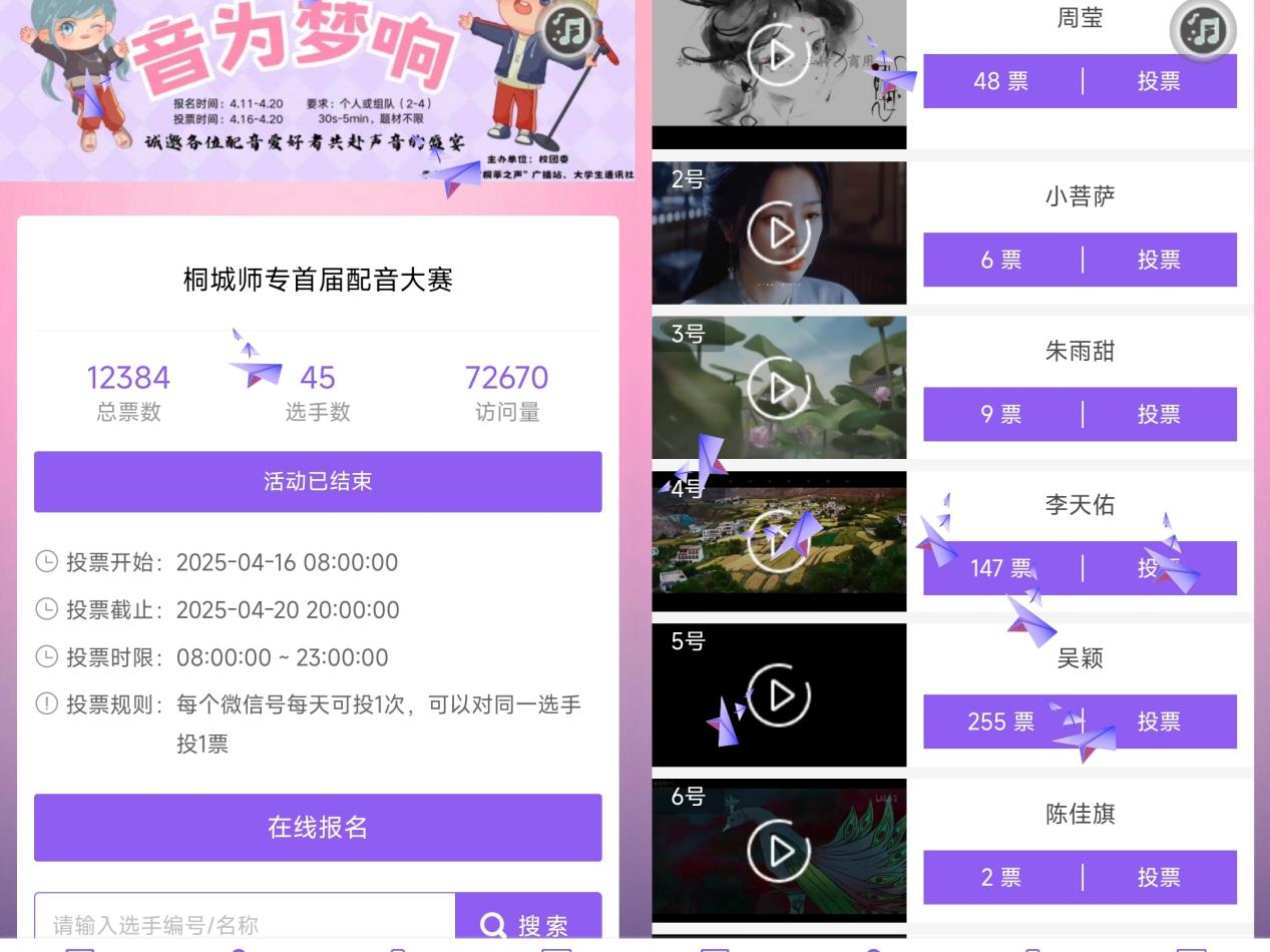 大賽自4月11日啟動以來,吸引了全校眾多配音愛好者踴躍參與。經嚴格初審,45項優秀作品脫穎而出,進入網絡投票與評委評審環節。活動期間,作品累計收獲12384張投票,瀏覽量突破7.2萬人次,在校園內掀起一股強勁的配音熱潮。這些作品題材廣泛,從承載著無數人回憶的經典電影,到充滿童趣的熱門動畫,再到引人入勝的知名電視劇,每一段配音都凝聚著選手們的心血與創意。經初賽視頻選拔,複賽現場激烈角逐,評委嚴苛依據音準匹配、情感表現、創意度及網絡投票折算分(占比10%)綜合評定,優中選優,最終8組實力選手脫穎而出,成功晉級決賽。