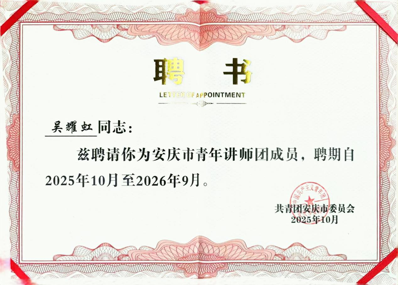 宣講環節結束後,主辦方領導為安慶市青年講師團成員頒發了聘書。這份聘書不僅是對青年宣講人過往工作的肯定,更是對大家未來持續開展思想引領、傳遞青春正能量的期許,進一步激發了青年講師團成員投身宣講工作、服務青年成長的責任感與使命感。