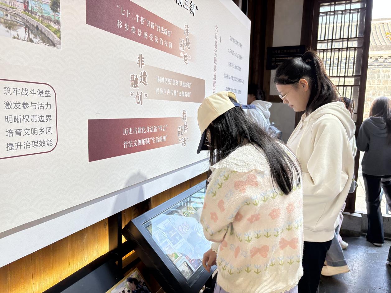 為確保此次活動能夠取得實實在在的教育效果,讓學生們獲得更加深入、係統的學習體驗,學校特別安排了專業講解員全程陪同並進行詳細解說。在展館內,講解員以“六尺巷”所蘊含的禮讓、和諧文化為切入點,結合新時代法治建設實踐案例,詳細介紹了“新時代六尺巷工作法”在基層治理、矛盾化解、法治宣傳等方麵的創新應用,生動闡釋了中華優秀傳統法律文化與現代法治精神的融合之道。同學們認真聆聽講解,不時駐足觀看展陳資料,圍繞“傳統禮治與現代法治的關係”“青少年如何踐行法治理念”等話題展開交流討論,在沉浸式體驗中進一步樹立了“憲法法律至上、法律麵前人人平等”的法治觀念。