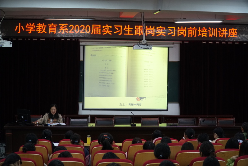 11月7日上午,小學教育係在以智樓一樓報告廳舉辦2020屆畢業生跟崗實習崗前培訓專題講座,邀請桐城市實驗小學教師夏豔為實習生主講“向統編教材的百花園漫溯——探尋統編教材教學新思路”。講座由小學教育係分管教學副主任陶家韻主持,小學教育係主任程愛蘭、部分教師以及全體實習生聆聽了講座。