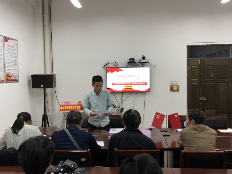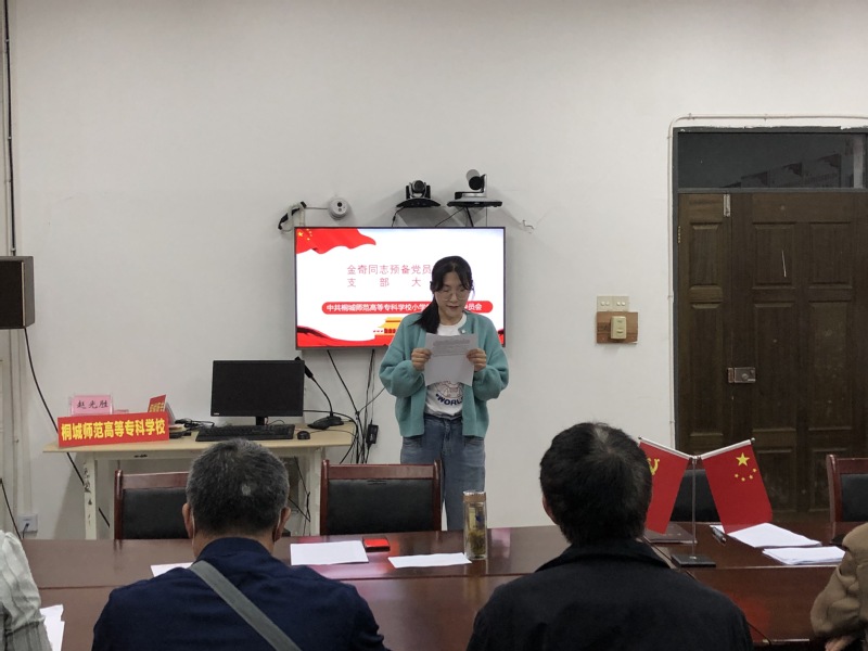 二是黨小組介紹金奇同誌在預備期間的表現情況和小組意見。第二黨小組組長趙玲對金奇同誌在預備期間的表現進行了客觀地評價,傳達了第二黨小組的討論結果,黨小組同意金奇同誌按期轉為中共正式黨員。 三是支部委員會介紹金奇同誌預備期間的教育考察情況。殷海紅副書記代表小學教育係黨支部支部委員會,對金奇同誌在預備期間的教育和考察情況向支部大會作了匯報,並向支部大會傳達了支委會成員同意金奇同誌按期轉正的支委會決議,請支部大會審議該決議。