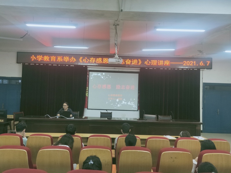 為了幫助學生更好健康成長成人成才,6月7日下午,小學教育係特邀請了學前教育係心理學教師胡敏在以智樓一樓報告廳作了“心存感恩,勵誌奮進”的心理講座。小學教育係分管副主任雷小麗和各班級心理健康委員聆聽了講座。