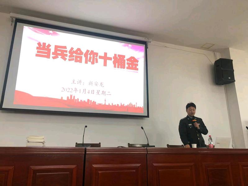 講座中,新安龍老師以自己的經曆為例,並結合課題生動形象的講述了當兵給同學們的“十桶金”:政治敏感性、堅強的意誌力、紀律觀念、團隊精神、組織協調能力、時間觀念、奉獻精神、溝通能力、良好習慣、強健的體魄。同時,他引用大量實例,從就業角度、成長角度、政治角度闡述大學畢業生參軍入伍為什麽值得選擇,以及怎樣走好從軍路。