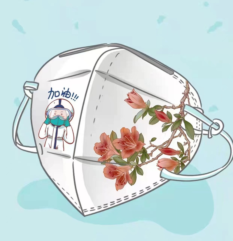 口罩右側為校園常見的花卉——杜鵑花,並將其以國風化的處理。左側是身穿防護膚的醫護人員“大白”作加油的姿勢,傳達出對防疫必勝的信心。口罩整體簡潔大方,充滿生機。