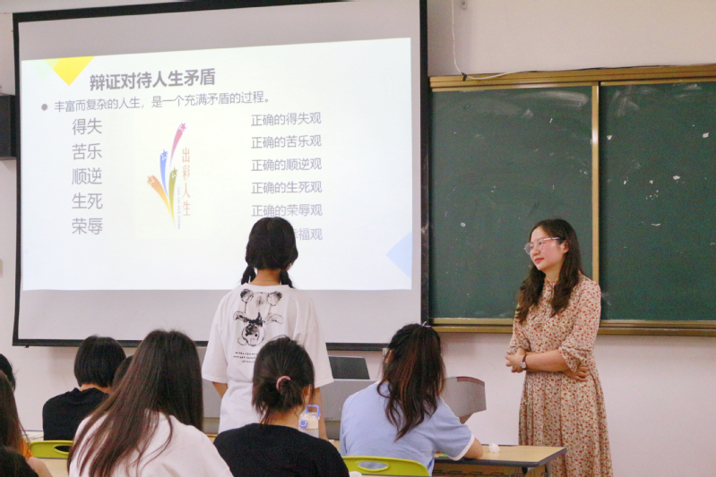 課堂上,程小娟老師從“什麽是‘意義’”問題入手,引導學生思考“價值”和“意義”的區別,以學生日常生活和當下熱點為切入點,循序漸進地引出三種錯誤的人生觀,並與學生互動深入探討錯誤人生觀導致的後果。程小娟以講授馬克思主義人生觀為主線,教育引導學生辯證地對待人生矛盾,交流分享學生心目中最敬佩的人,舉例桐城當地的典型人物“江覺遲”事跡,進一步引導學生思考怎樣才是有意義的人生,怎樣才能創造有意義的人生。