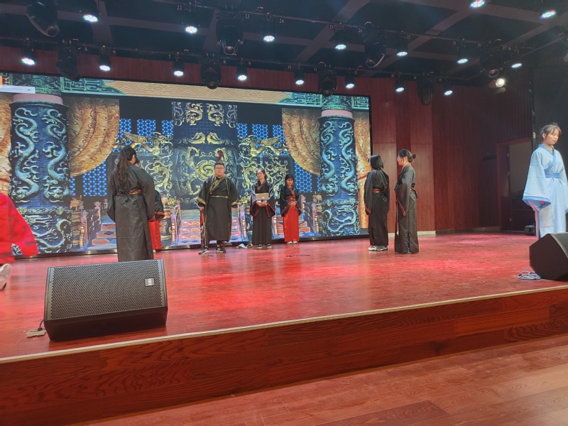 伴隨著聲色相惜古典音樂旋律的響起,展演活動在《荊軻刺秦王》的舞台演繹中徐徐拉開帷幕。從“風蕭蕭兮易水寒,壯士一去兮不複還”的慷慨豪邁到“圖窮匕見”,秦王繞柱斬殺荊軻的悲慘壯烈,同學們用自己精彩的表演再現了春秋戰國時代那段群雄爭霸、逐鹿中原,獨屬於中國人的英雄史詩場景。