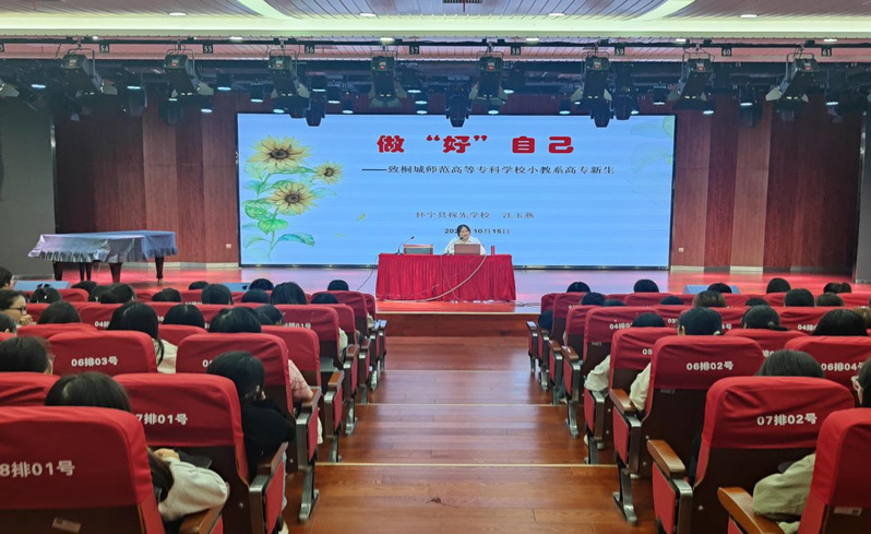 小教係深入貫徹落實習近平新時代中國特色社會主義思想,推進主題教育走深走實,同時為了更好落實立德樹人根本任務,培養德智體美勞全麵發展的社會主義建設者和接班人,踐行我校五大育人工程中的“榜樣引領”育人示範作用,幫助2023級新生盡快適應新的學習環境、樹立人生奮鬥目標、激發其奮發向上向善的學習熱情、助其養成良好的學習習慣和淬煉持之以恒的學習毅力,10月15日上午,在校音樂廳,小學教育係特盛情邀請了我校98級優秀學子,現為懷寧縣稼先學校的副校長汪玉燕,舉辦了題為“做‘好'自己——致桐城師專小教係高專新生”的勵誌報告活動。報告會由小學教育係兼思政部副主任雷小麗主持,小教係全體23級高專新生386人聆聽了勵誌報告。