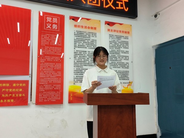 在莊嚴的國歌聲中我係新團員入團儀式正式開始,團總支副書記陳婷宣布新團員名單。 隨後,黨員代表郭曉瑋老師、團總支書記程蓉蓉為新團員頒發團徽徽章和團員證。優秀團員代表盛丹丹同學領誓下,各位新團員麵向團旗、右手握拳舉過肩,在團旗下莊嚴宣誓,每個新團員都在高喊宣誓,激情澎湃。