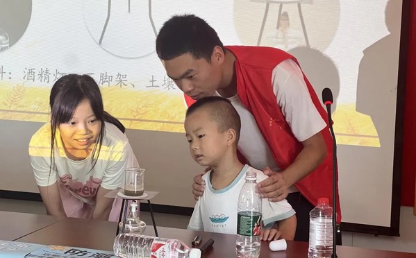 殷匯鎮滄埠村 在交流中,實踐團不僅感受到了基層幹部對於鄉村振興的信心、更感受了他們讓農村變得更好,讓農民變得更富,而且就地就能過上幸福生活的決心。 02樂趣課堂,普及科學知識潤童心 調研結束,實踐團隊先後在東溪村、滄埠村村部開展了三場知識講座。 土壤中的秘密 科普員朱功學現場講解《土壤中的秘密》,介紹了土壤的成分、種類和重要性。他帶領著小朋友們一起做實驗,通過親手操作,讓小朋友們更加深刻的感受到土壤中的奧秘,使科學知識變得通俗易懂。