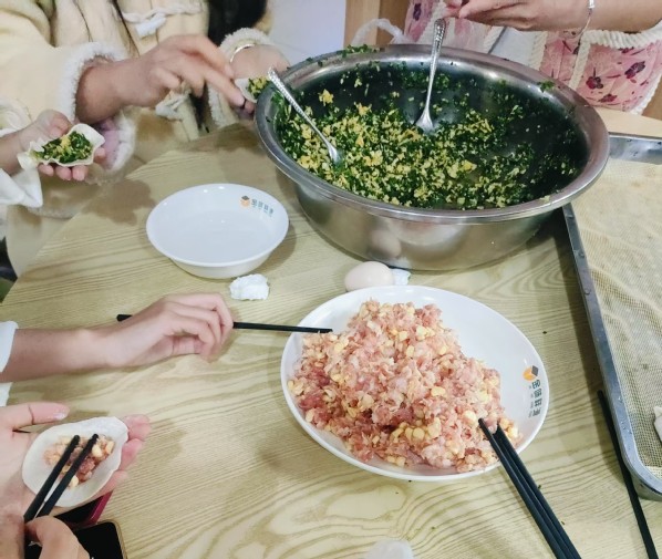 隨著活動正式開始,同學們迅速投入到包餃子的過程中。大家圍坐在一起,手裏拿著餃子皮,放上適量的餡料,然後小心翼翼地捏合餃子皮,一個個形狀各異的餃子逐漸成形。有的同學是包餃子高手,手法熟練,包出的餃子既美觀又結實;有的同學則是初學者,雖然手法略顯生疏,但在同學們的指導和幫助下,也逐漸掌握了包餃子的技巧。現場歡聲笑語不斷,氣氛熱烈而溫馨。